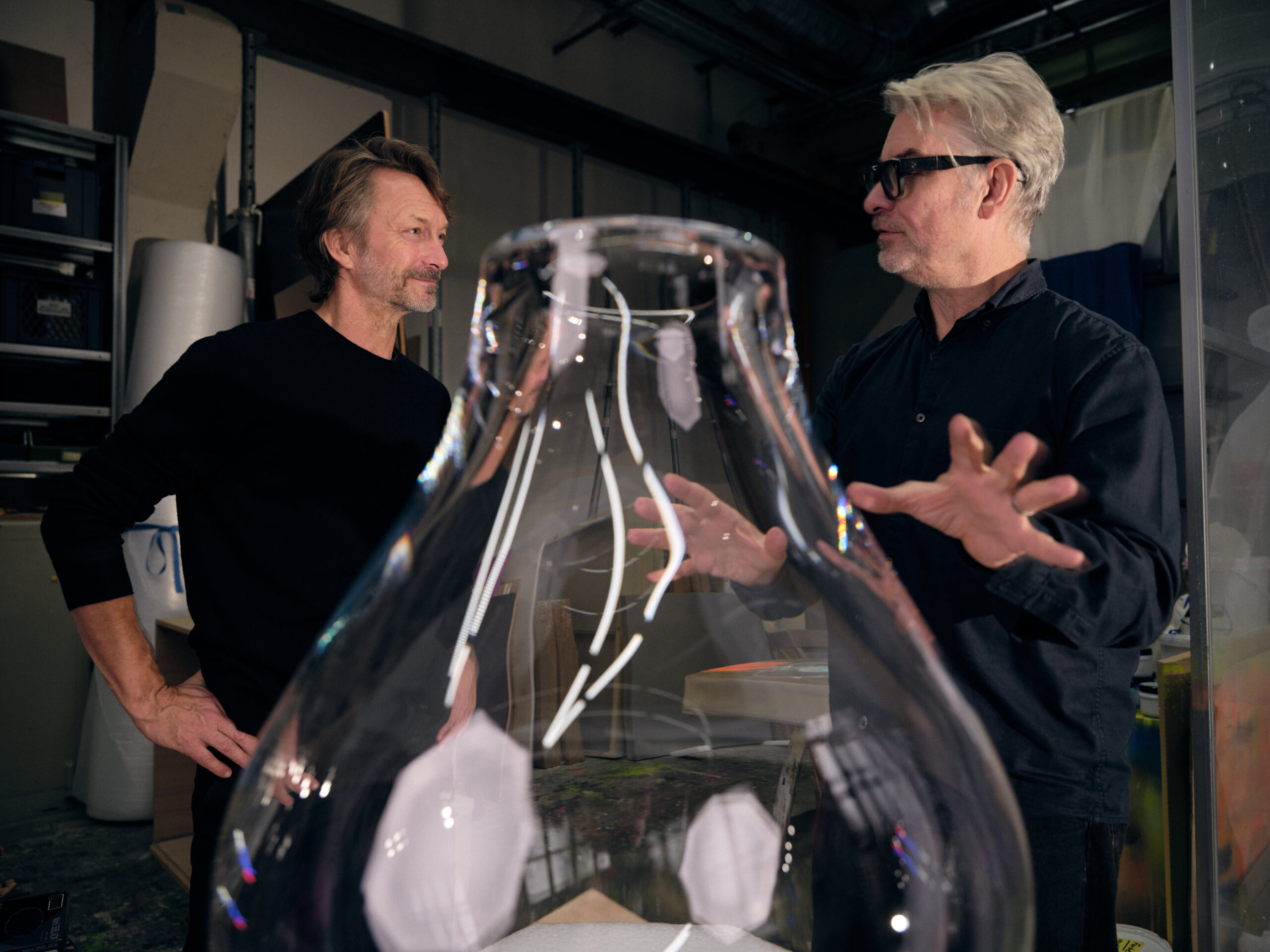 Tim, the very first light produced at the BOMMA glassworks ten years ago, has over the past decade become a recognizable element of contemporary Czech design. In this anniversary edition, Anselm Reyle lends the piece his distinctive artistic language. Known for his foil and striped paintings and for recontextualizing found objects, Reyle brings to glass a painterly gesture that both respects and transcends the light’s original form.