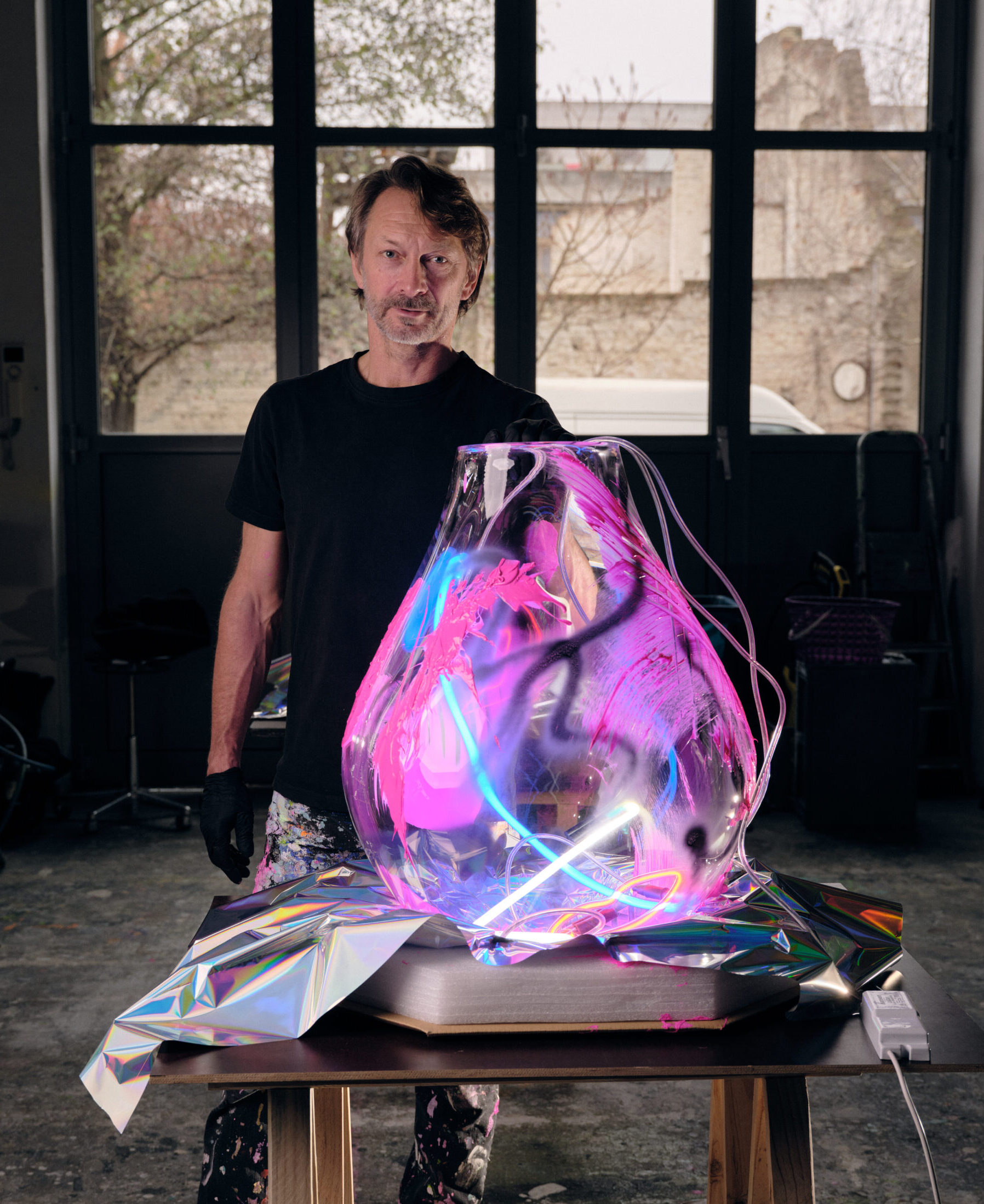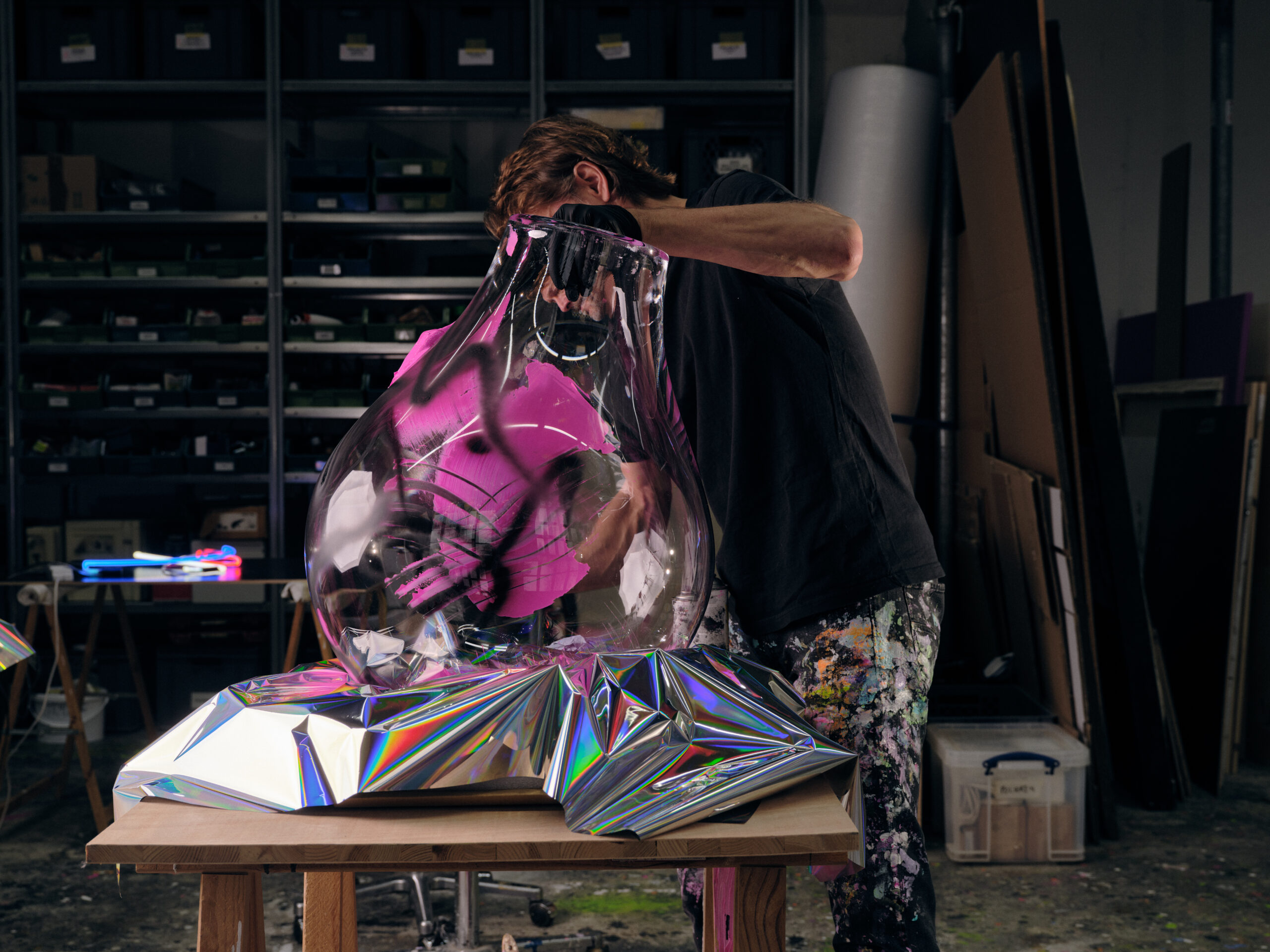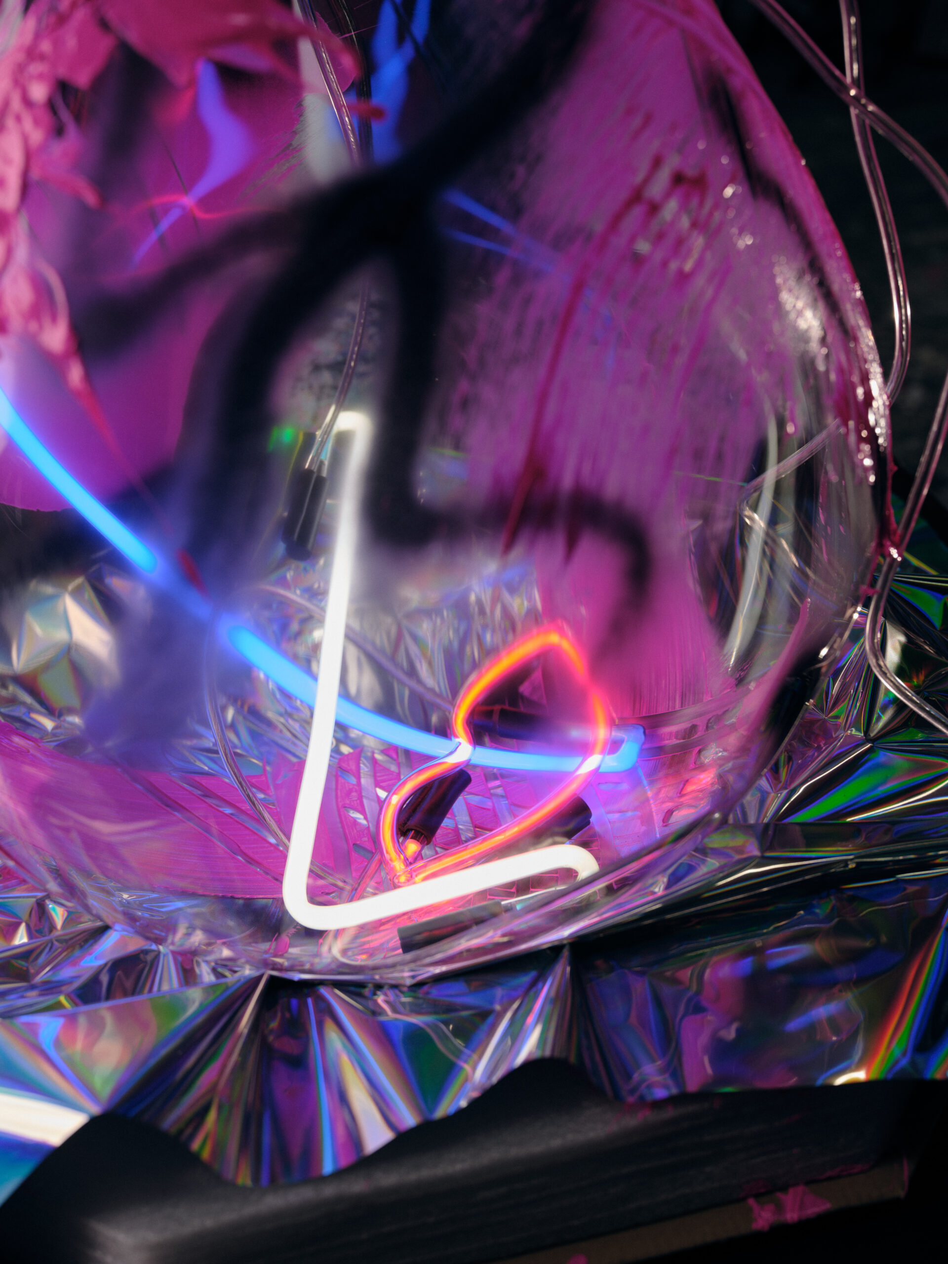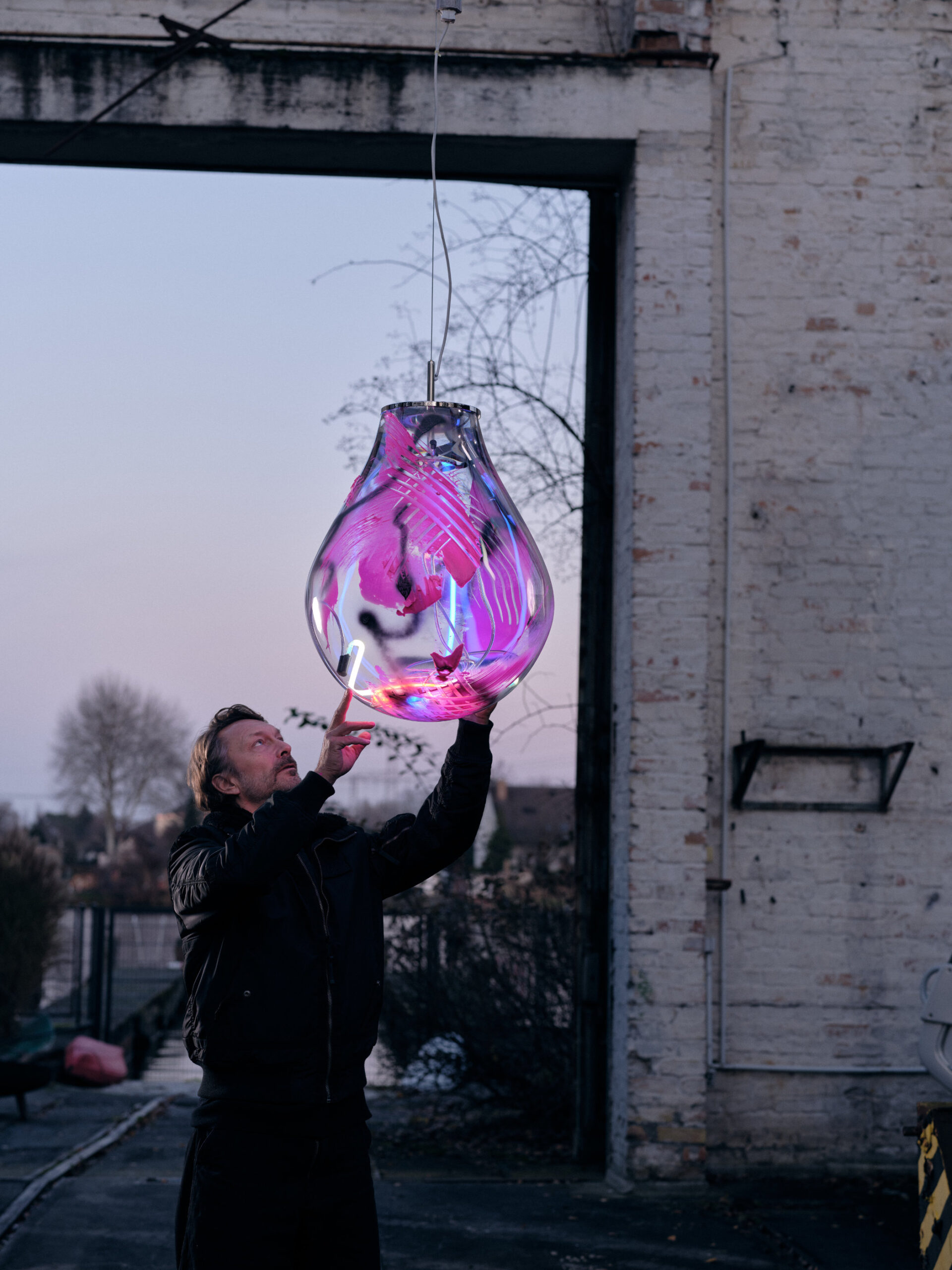 Each monumental, hand-blown light is complemented by spontaneous strokes of black spray paint and neon pink acrylic. Bold neons inside replace the conventional light source, giving the object a new, pulsating expression.
