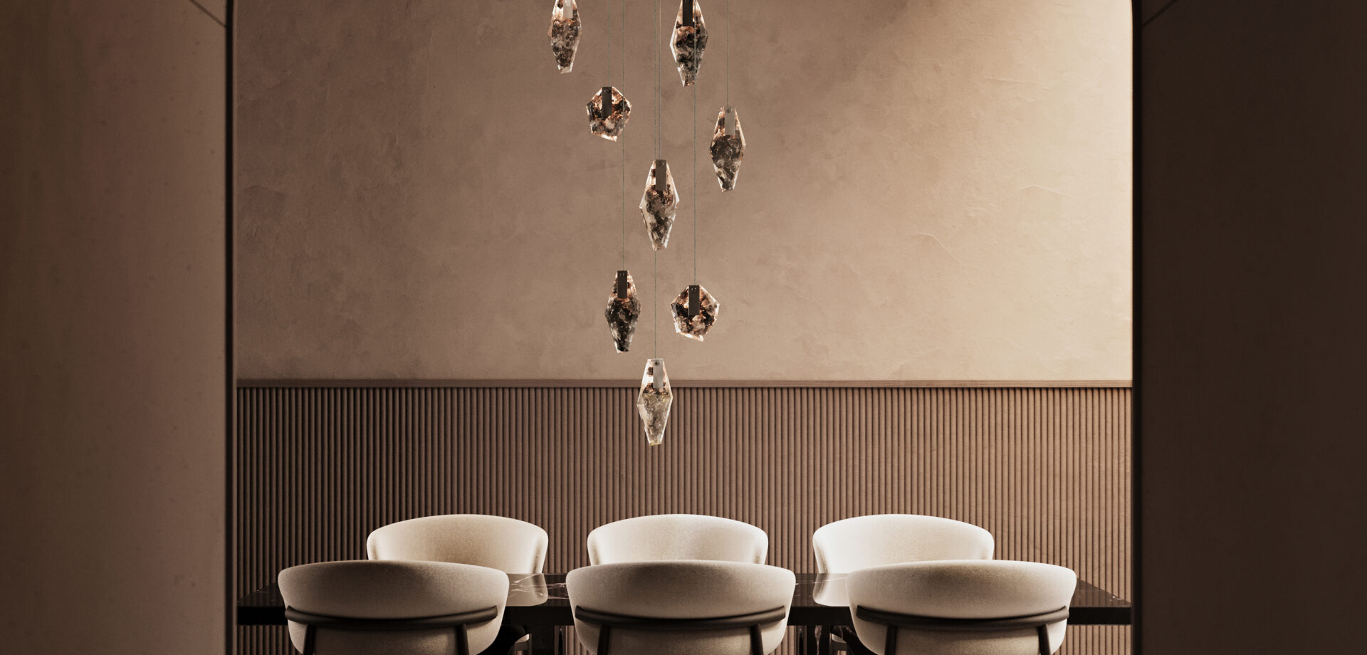 Atmosféru velkorysého jídelního prostoru umocňuje světelná konstelace nové kolekce Fragments. Již při vstupu láká jako centrální prvek do jídelní zóny a zve ke stolu. Pod rouškou krásy broušeného krystalu stojí nevšední proces výroby z nevyužitých skleněných střepů z produkce Bommy. Kombinace krátkých a dlouhých svítidel záměrně vytváří specifický tvar konstelace, který přináší do interiéru jedinečnou hru světla a stínů.