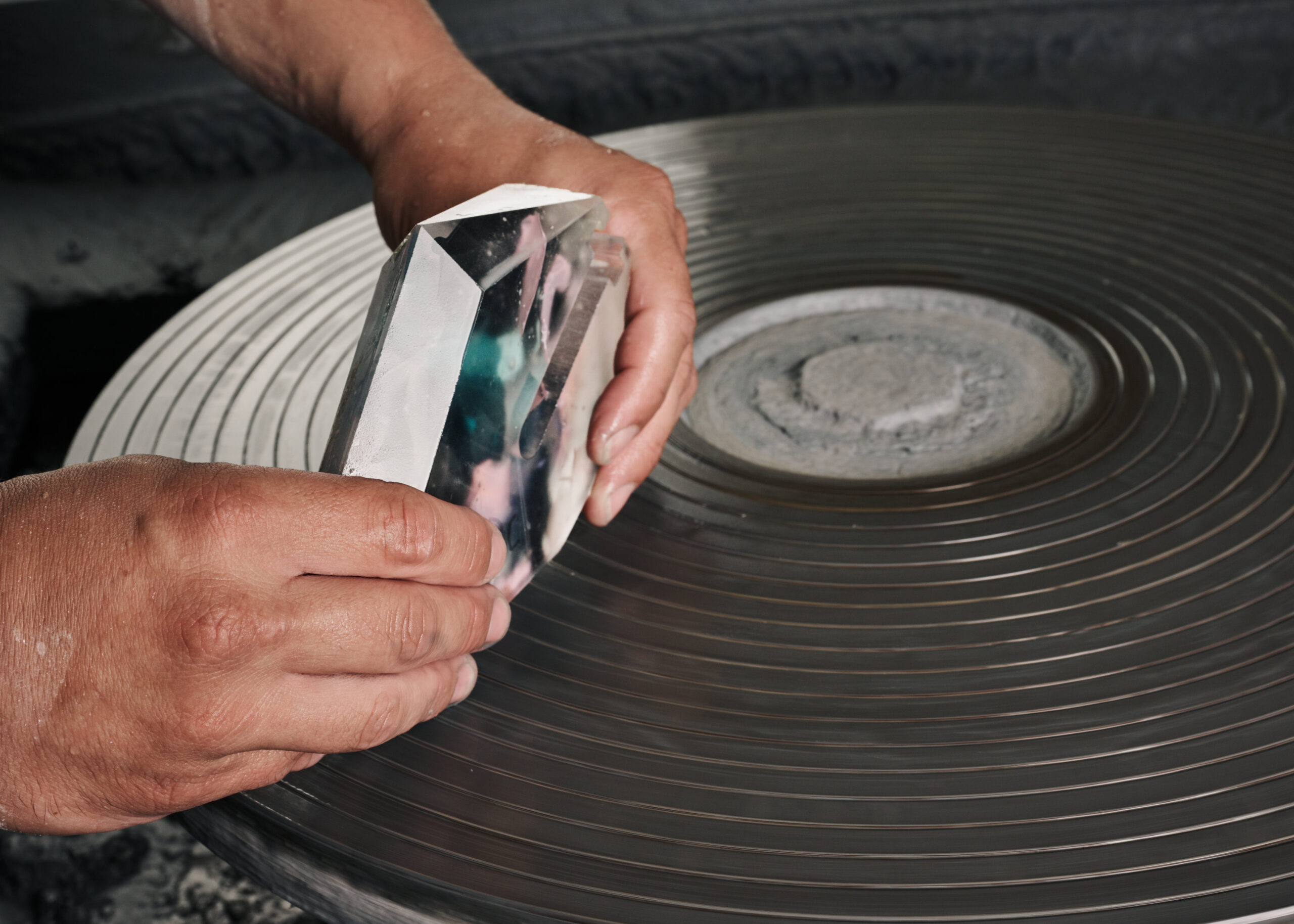 Each Fragmentglass panel is carefully assembled by stacking glass shards into a melting mold. The resulting structure is quite unpredictable as the melting process itself cannot be controlled. Each piece is first cut from the Fragmentglass panel and then meticulously hand-cut by the master glass cutter.
