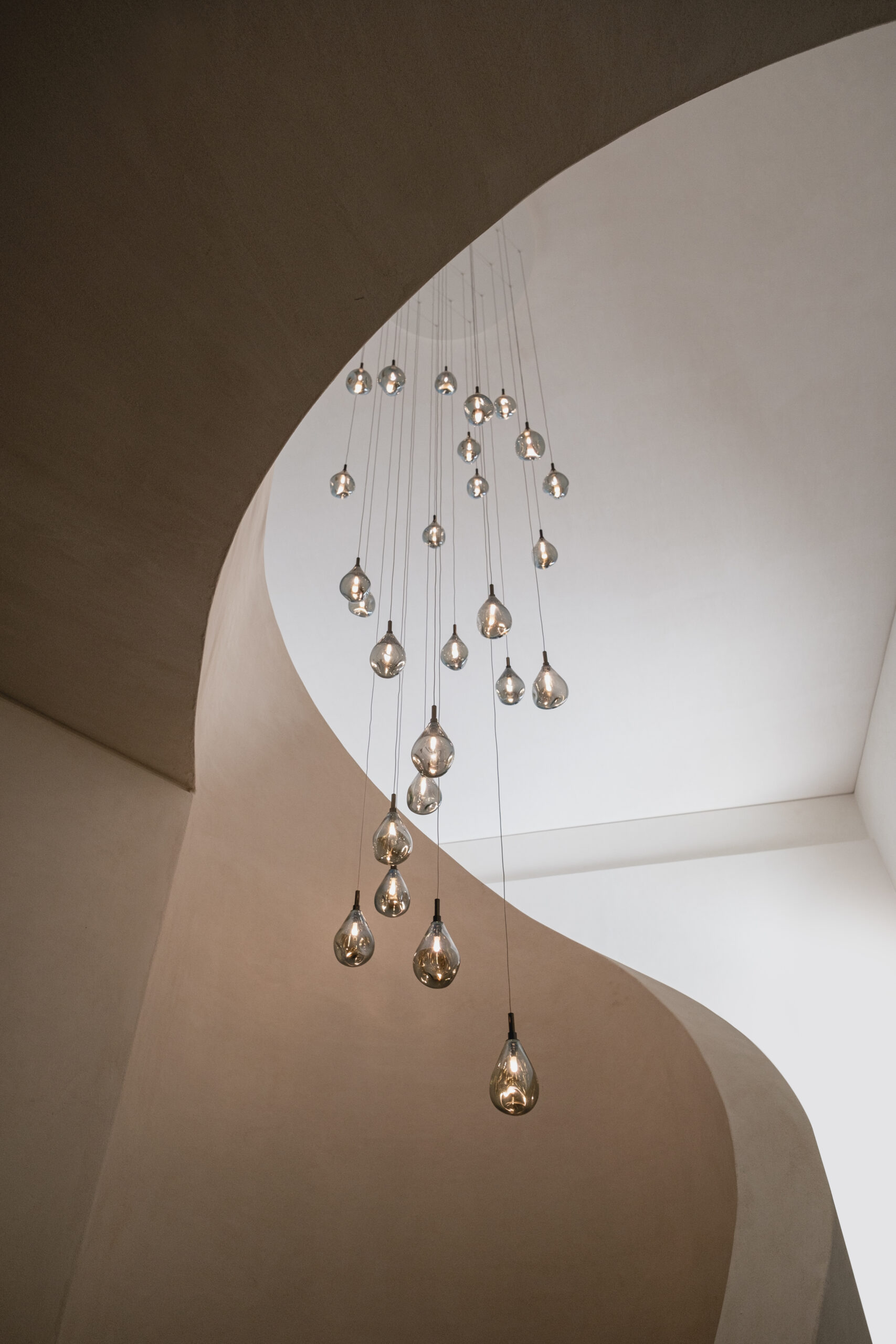 Lighting installation made out of 26 Soap mini silver pendants decorates the winding staircase in a private villa in Egypt. The architect of the villa is renowned Yasmina Makram. The pendant lights create a wave shape that copies the staircase silhouette with elegance.