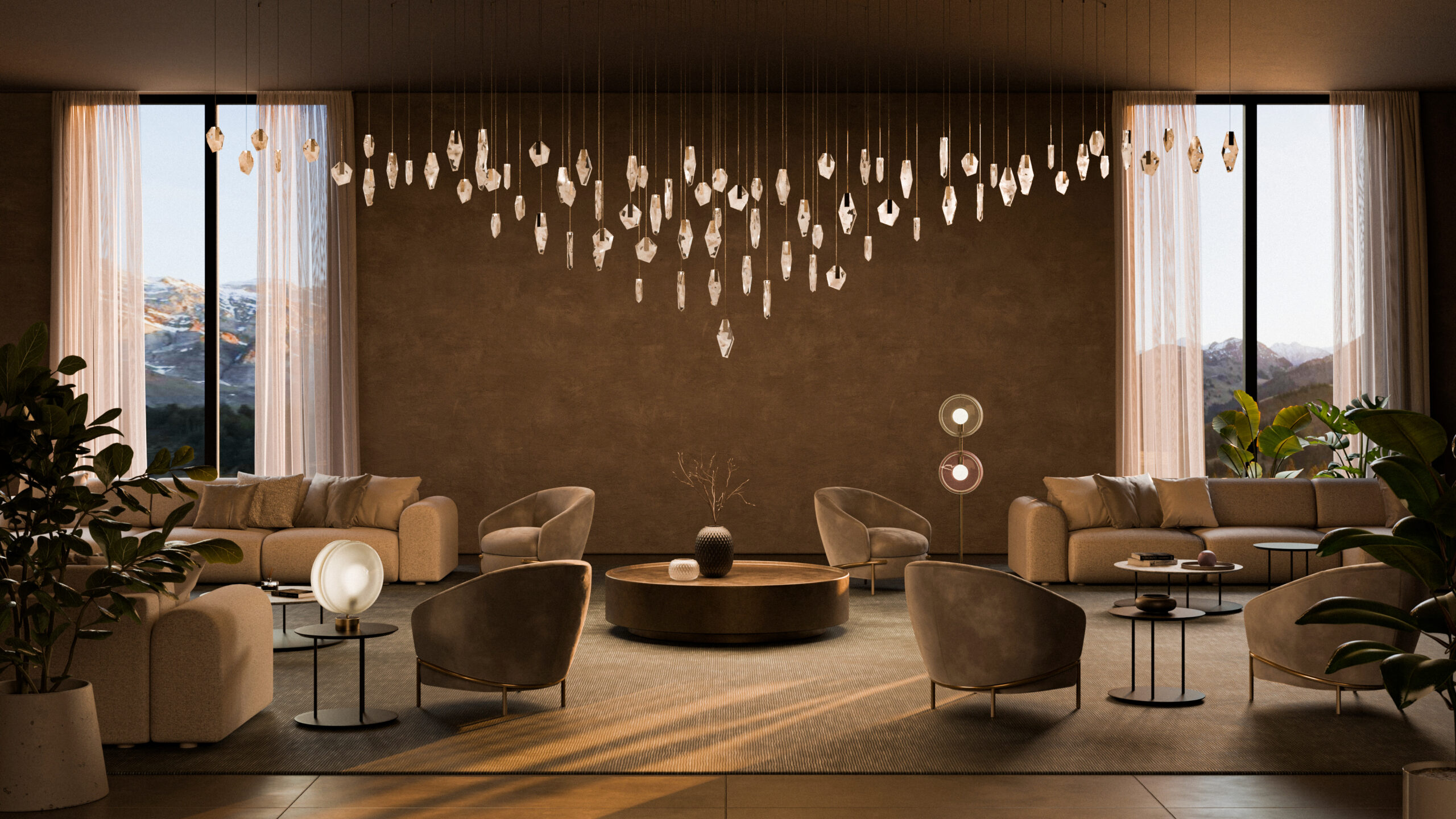 A constellation of Fragments pendants transforms this earth-toned lobby into a breathtaking landscape of light.