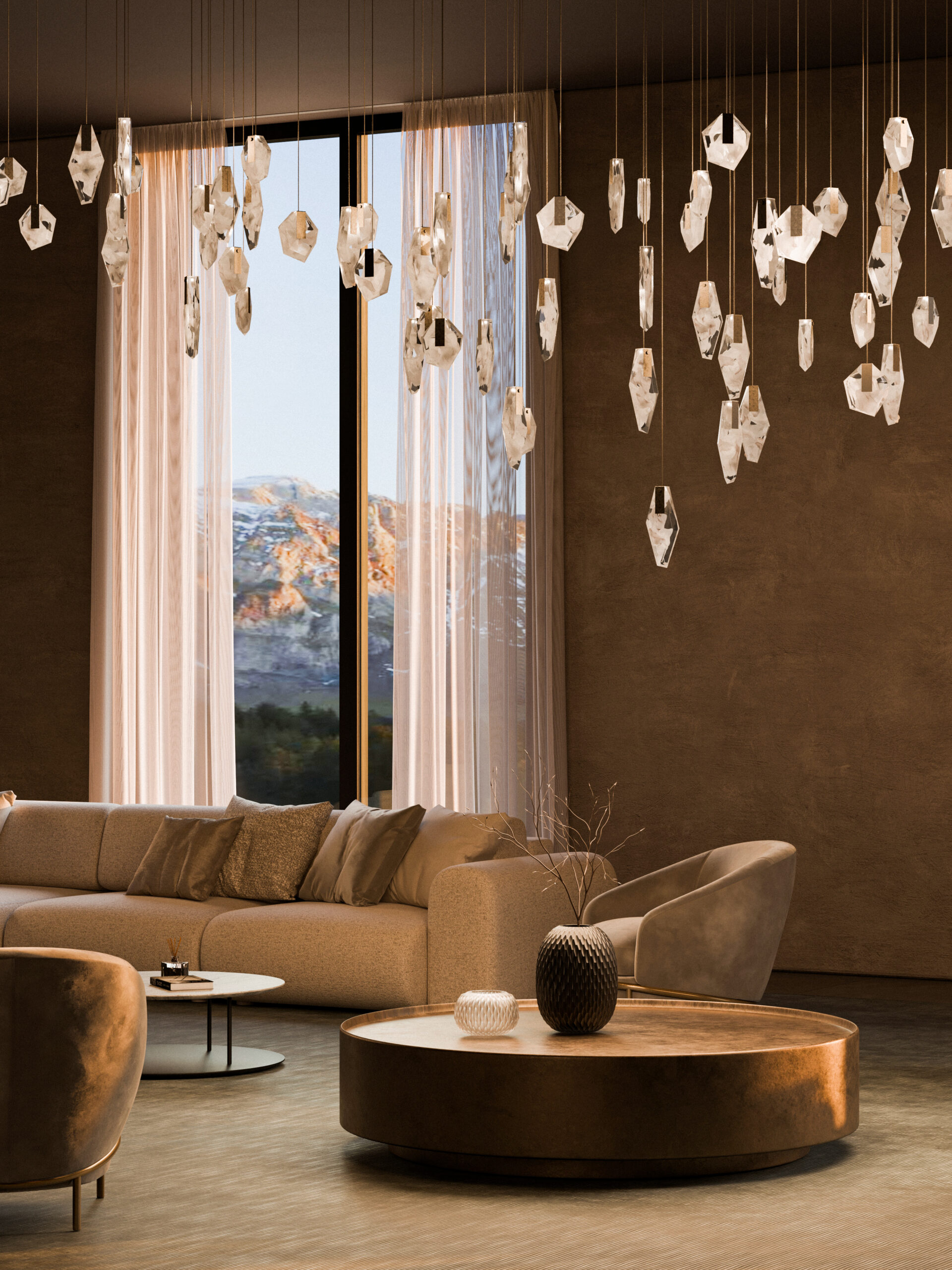 In this spacious, earth-toned lobby, the large-installation of the Fragments collection pendants creates a breathtaking focal point. Suspended above the seating area, a wave of crystal shards floats weightlessly, reflecting the natural light from the panoramic windows. This dramatic installation beautifully connects raw, natural forms with sophisticated modern design, enhancing the room’s deeply tranquil atmosphere. Bomma allows you to assemble individual luminaires in constellations to create an original lighting combination of 3 to 26 components.